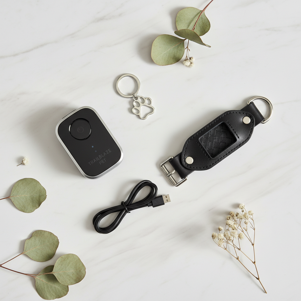 Elegant flat lay of GPS tracker with accessories